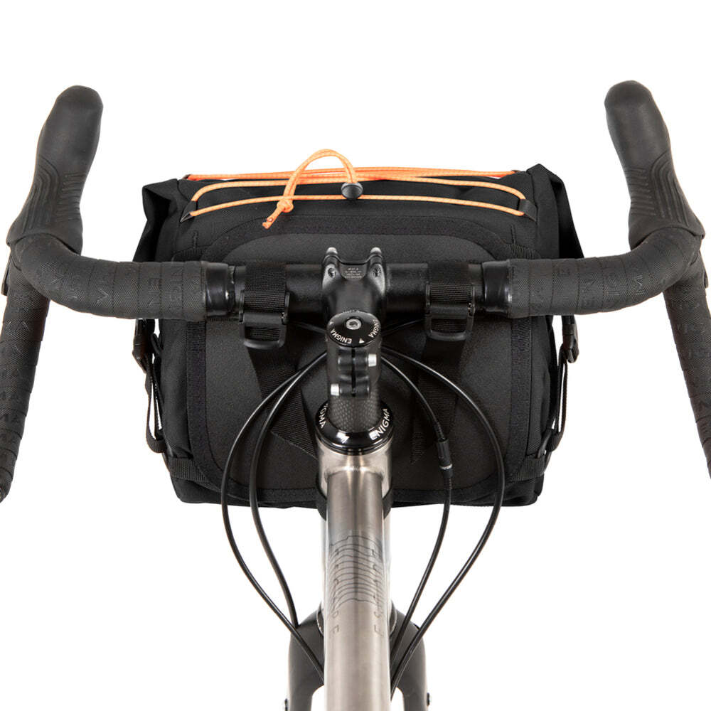 Two fully waterproof roll top compartments provide 10 litres of capacityIdeal for shop runs off road adventures or audaxes the Bar Pack is the perfect all day companion. Two fully waterproof roll top compartments provide 10 litres of capacity with a hypalon closure securing the front compartment and providing a mounting slot for a clip-on front light or additional strapping. A mini D-lock holster sits between the two compartments with the front compartment closure doubling as a securing strap for a lock for any urban excursions.
