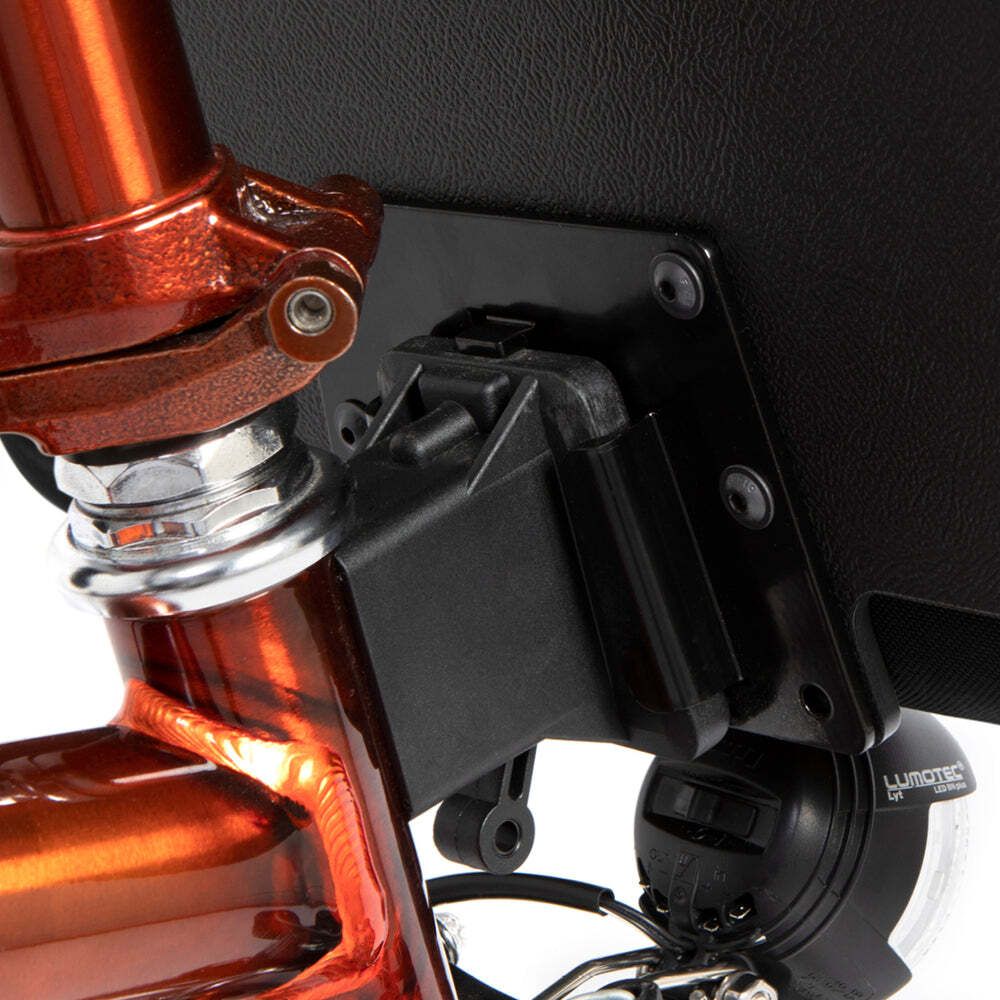 The bag is mounted via a Brompton front carrier block compatible fitting both external and internal stiffeners enable the bag to hold its shape even when fully loaded. Made of 100% waterproof textured nylon with a tape sealed lining spare clothes and tech are guaranteed to stay dry on the wettest of rides. The bag is also compatible with a Brompton front light dyno light and front reflector.