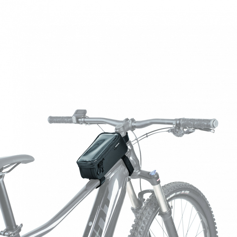 A top tube bag and phone case 2-in-1 design, featuring a transparent protective film that allows you to operate your phone while it's inside the bag. The second compartment of the bag features dividers that allow you to easily organize and store small items such as credit cards, loose change, keys, and other personal belongings.