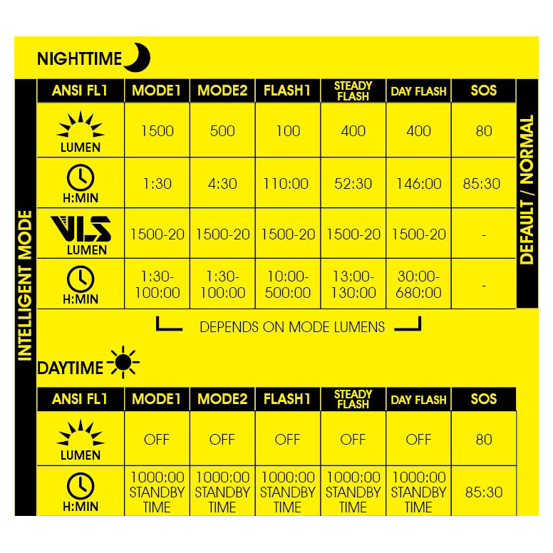 - 5 modes: DAY FLASH / STEADY FLASH / FLASH 1 / MODE 1/ MODE 2
