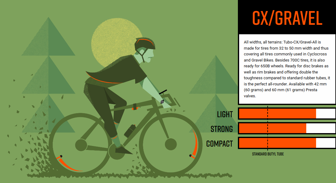 CX / Gravel: All widths all terrains: Tubo-CX/Gravel-All is made for tyres from 32 to 50mm width and thus covering all tyres commonly used in Cyclocross and Gravel Bikes. Besides 700C tires it is also ready for 650B wheels.