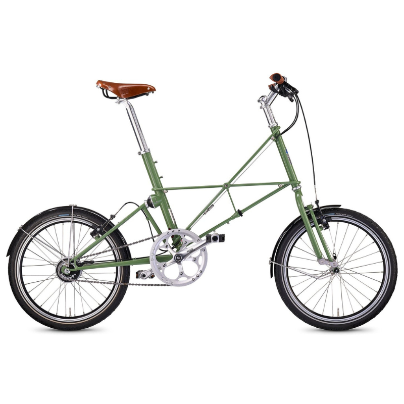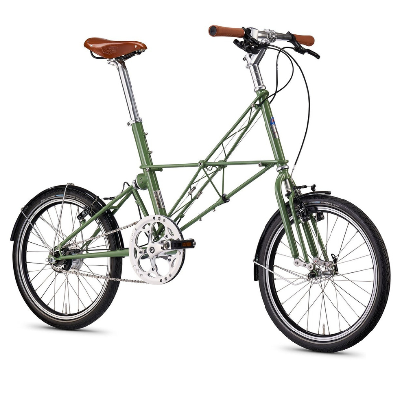 A separable unisex Moulton spaceframe in Columbus Spirit and Reynolds 525 CrMo steels, hand brazed; finished in Hall Green colour and adorned with a unique engraved special edition badge affixed to the seat tube.